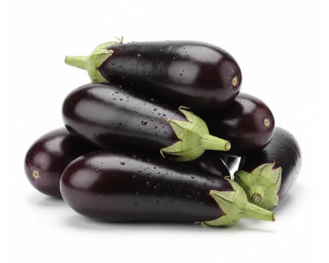 The Brinjal (Solanum melongena) comes in a remarkable variety of shapes, sizes, and colors. While the most common type is egg-shaped and dark purple, other varieties can be long and slender, round, or even white, green, and striped. The skin is smooth and shiny, covering a creamy-white or pale green interior with a spongy texture.